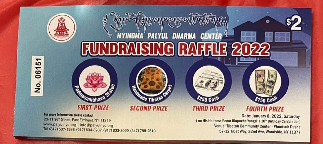 Tickets for the raffle drawing can be purchased either securely through our website by clicking the link below, or in-person at Nyingma Palyul Dharma Center. If you purchase raffle tickets through the website, they will automatically be included in the raffle drawing (attendance not required):