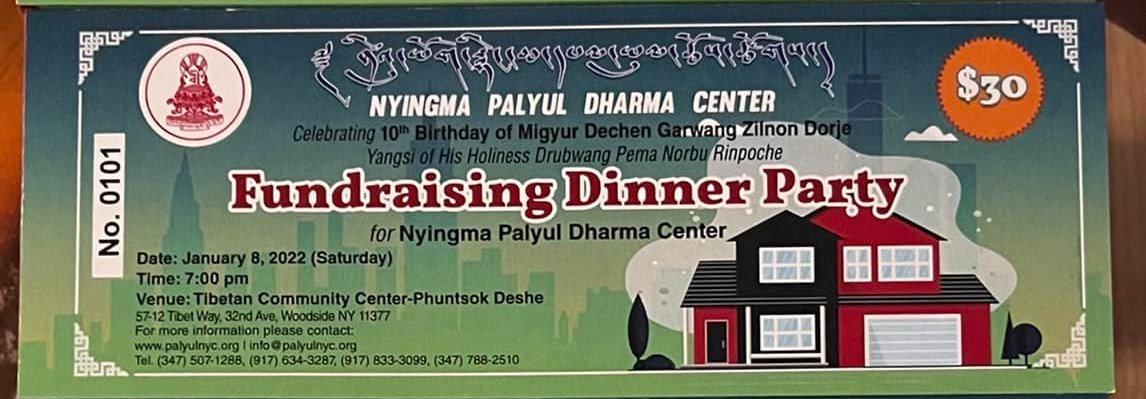 Tickets for the Dinner Party (beginning @ 7 pm) can be purchased either securely through our website by clicking the link below, or in-person at Nyingma Palyul Dharma Center. If you purchase dinner tickets through our website, you will receive a confirmation email which serves as your ticket(s).