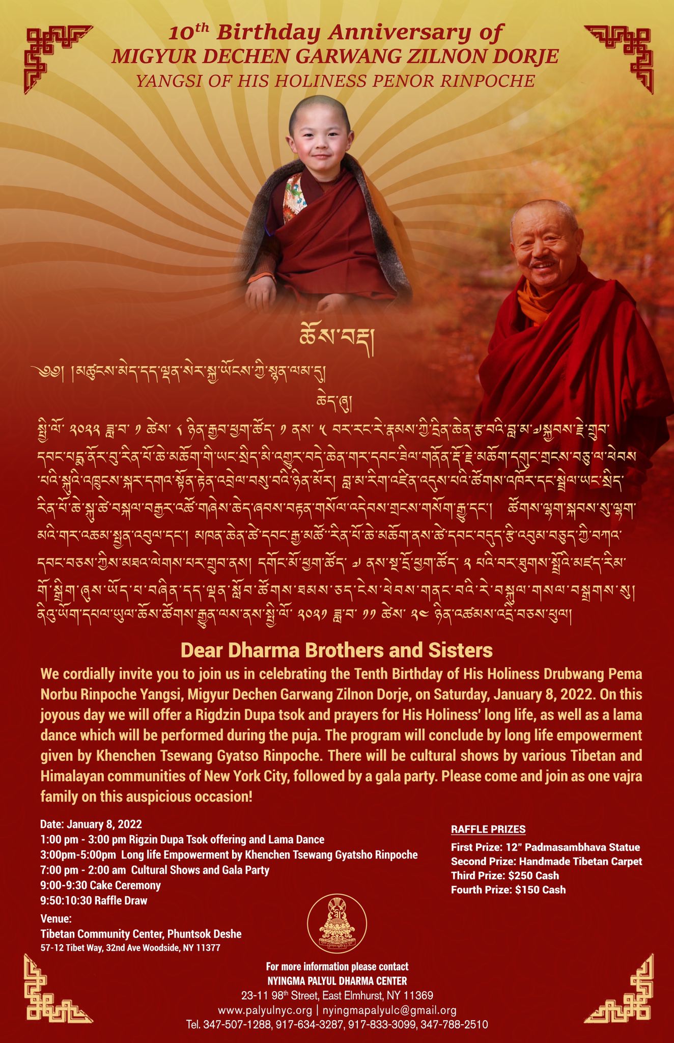 We cordially invite you to join us in celebrating the 10th Birthday of His Holiness Drubwang Pema Norbu Rinpoche Yangsi, Migyur Dechen Garwang Zilnon Dorje, on Saturday, January 8, 2022 at the Tibetan Community Center in Woodside, Queens. On this joyous day we will offer a Rigdzin Dupa tsok, make prayers for His Holiness’ long life, and perform a lama dance. Then we are honored and blessed that Khenchen Tsewang Gyatso Rinpoche will bestow a long life empowerment (tse-wang). ** The tsok and lama dance will be broadcasted live on Facebook and Zoom (links below) **
