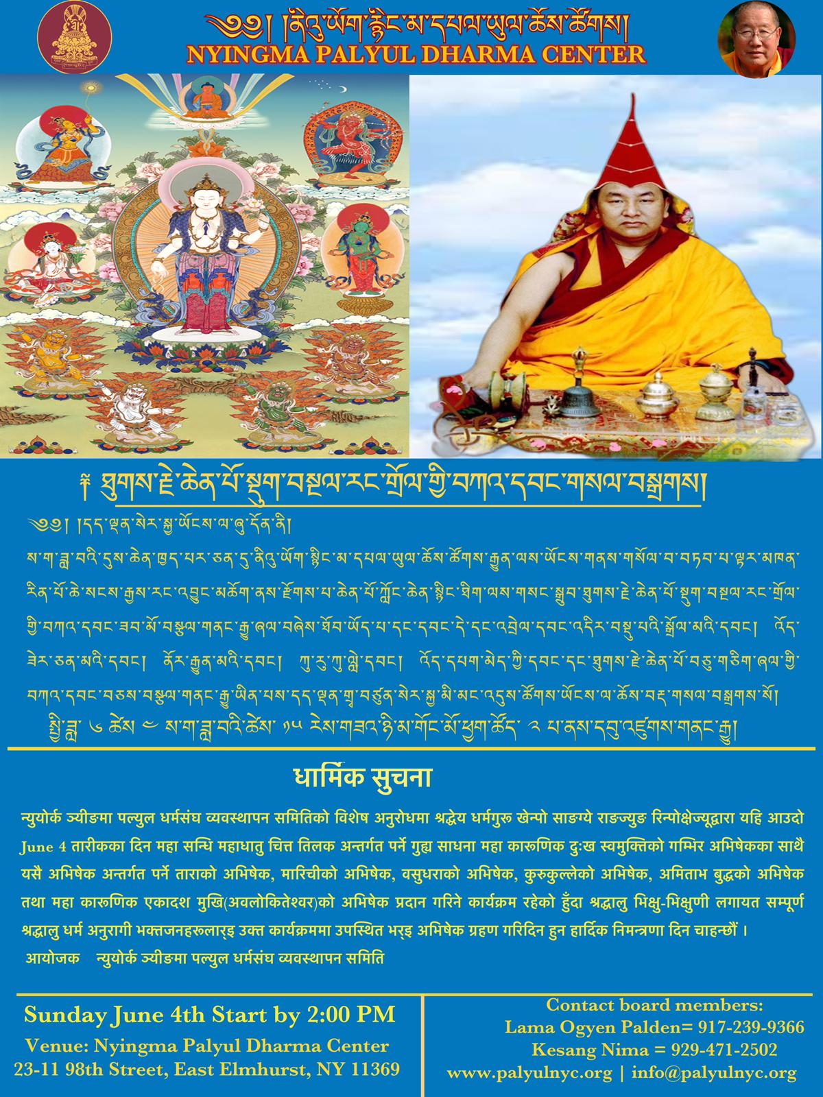 恰逢佛誕節,纽约市寧瑪白玉佛法中心誠意邀請H. E. Khenpo Sungay Rangjung Rinpoche 授于大慈大悲觀世音菩薩灌頂, 此法是Longchen Nyingthik [龍欽寧提] 中的 Natural Liberation of Suffering 困苦自然解脫論。此灌頂包括: Tara 度母,Marici 摩利支天佛母,Basudara (Vasudhara) 持世觀音, Kurukule 咕嚕咕列佛母, Amitabha 阿彌陀佛 及 1000 Hand Avalokiteshvara千手千眼觀世音菩薩。鼓勵僧團和信眾利用這個良機接受這些灌頂,以利益自己和他人。