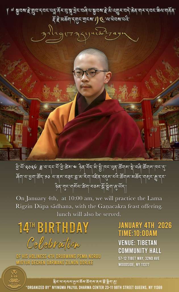 We cordially invite all Palyul students, friends, and family to join in celebrating the 14th Birthday of our Guru, His Holiness Penor Rinpoche Yangsi, this Sunday, January 4, from 10:00 a.m. to 6:00 p.m. ET at the Tibetan Community Center in Queens, NYC.