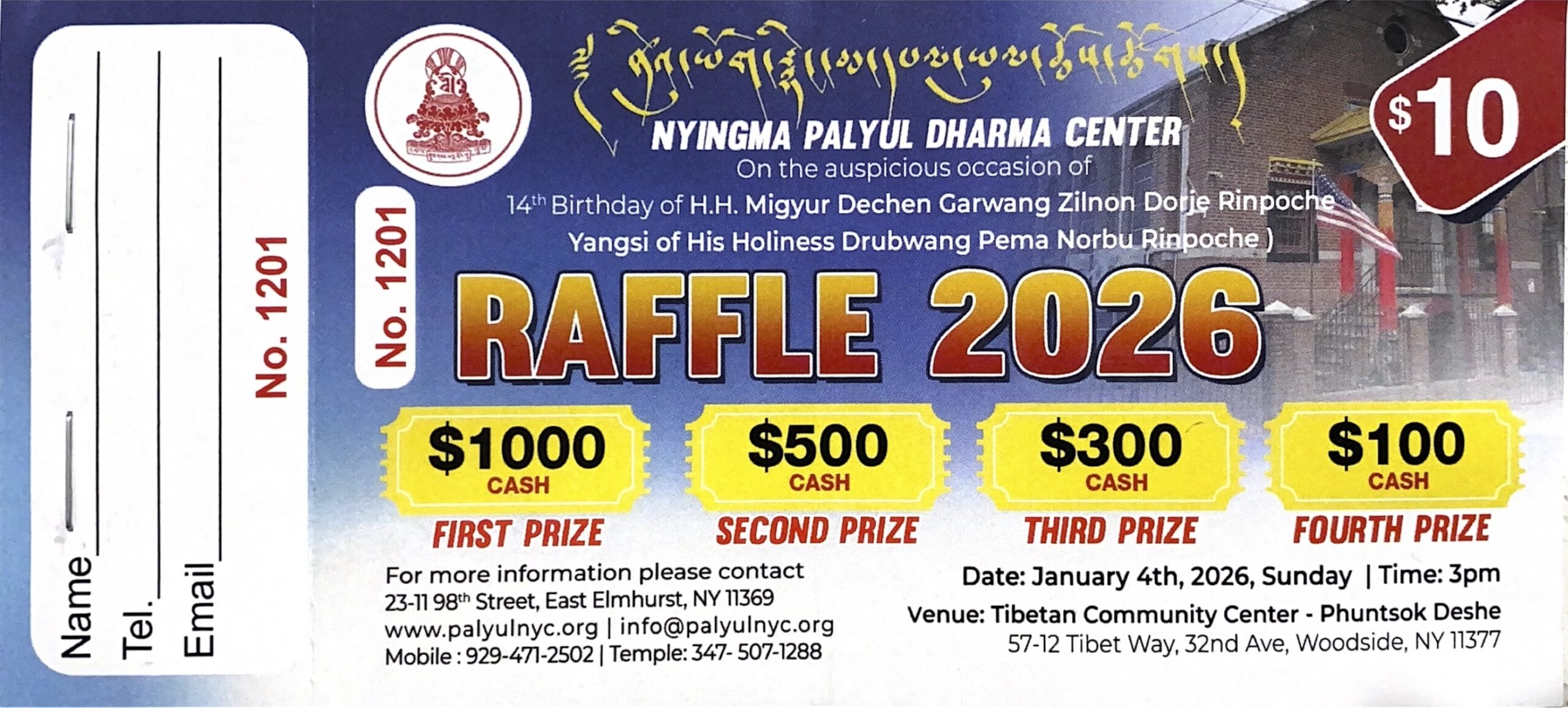 Raffle tickets are $10 each and can be purchased at the event, at the Center, or through our website. All proceeds from ticket sales will support Nyingma Palyul Dharma Center.