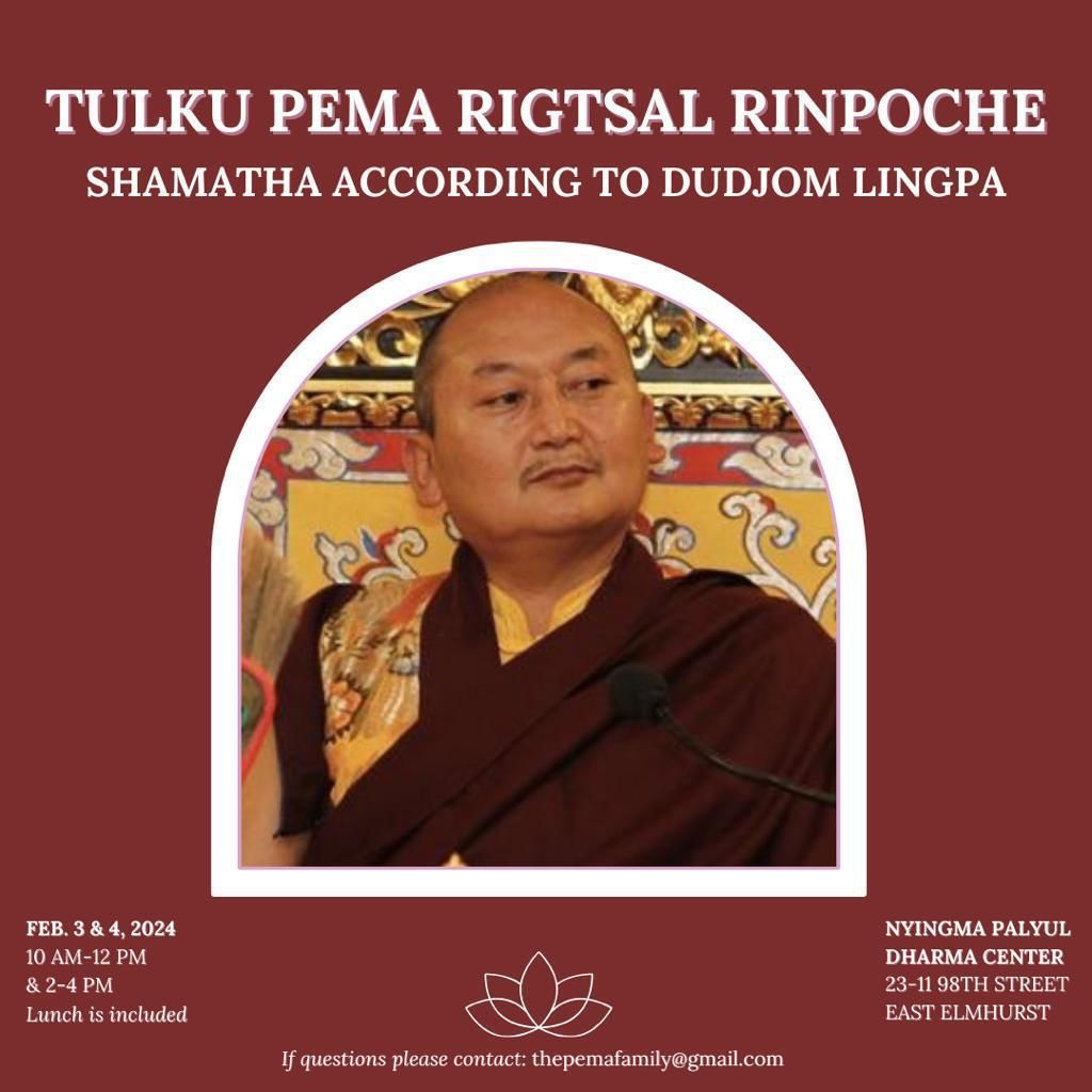 It is our pleasure to inform everyone that Tulku Pema Rigtsal, one of the primary holders of the Dudjom Tersar Lineage and abbot of Namkha Khyung Dzong Monastery in Nepal, will give the Shamatha meditation instructions of Dudjom Lingpa, Saturday and Sunday, February 3 and 4 at Nyingma Palyul Dharma Center. All are welcome to attend, and lunch will be served. This teaching program will also be live on Zoom (link below).