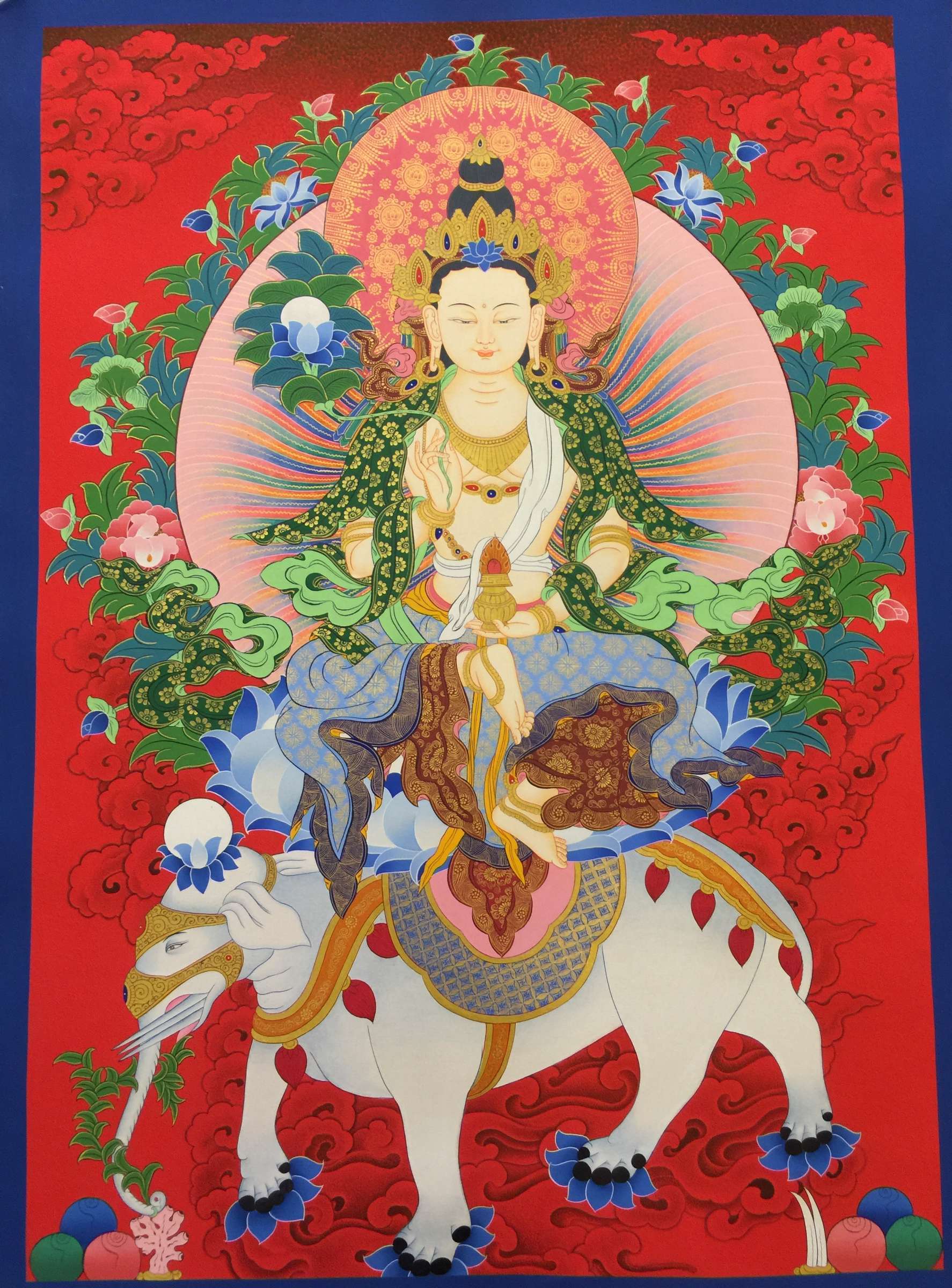 Extracted from the final chapter of the Flower Garland Sutra (Avataṃsaka Sūtra), The King of Aspirations Prayers is a profound aspiration prayer made by Samantabhadra, one of the Eight Bodhisattvas, and is one of the main aspiration prayers chanted by all schools of the Tibetan Buddhist tradition. It condenses all prayers to remain steadfast on the Mahayana path and be free of obstacles, ensuring that the merit and wisdom one has accumulated ripens in the most beneficial ways for oneself and all sentient beings. By reciting this prayer with devotion, it is said that one will be able to purify all negativeness, even the five heinous actions, and at the moment of death be reborn in Sukhavati where one will have the perfect conditions to continue one’s path and bring happiness and benefit to all beings.